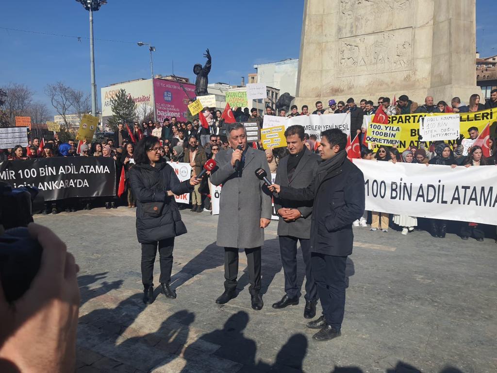 Türk Eğitim-Sen Genel Merkezi ataması yapılmayan öğretmenlerin eylemine destek verdi. Genel Sekreter Haydar Urfalı ve Genel Başkan Yardımcısı Selahattin Dolgun’un katıldığı eylemde öğretmenler, Cumhuriyetimizin 100. Yılında 100 bin atama talep ettiler. Ankara Ulus Meydanı’ndan seslerini duyuran öğretmenler, Ne fıstık isteriz ne baklava. İsteriz 100 bin atama”, “Öğretmenler Ulus’ta, atama nerede”, “Susma haykır, 100 bin haktır” sloganları attılar.