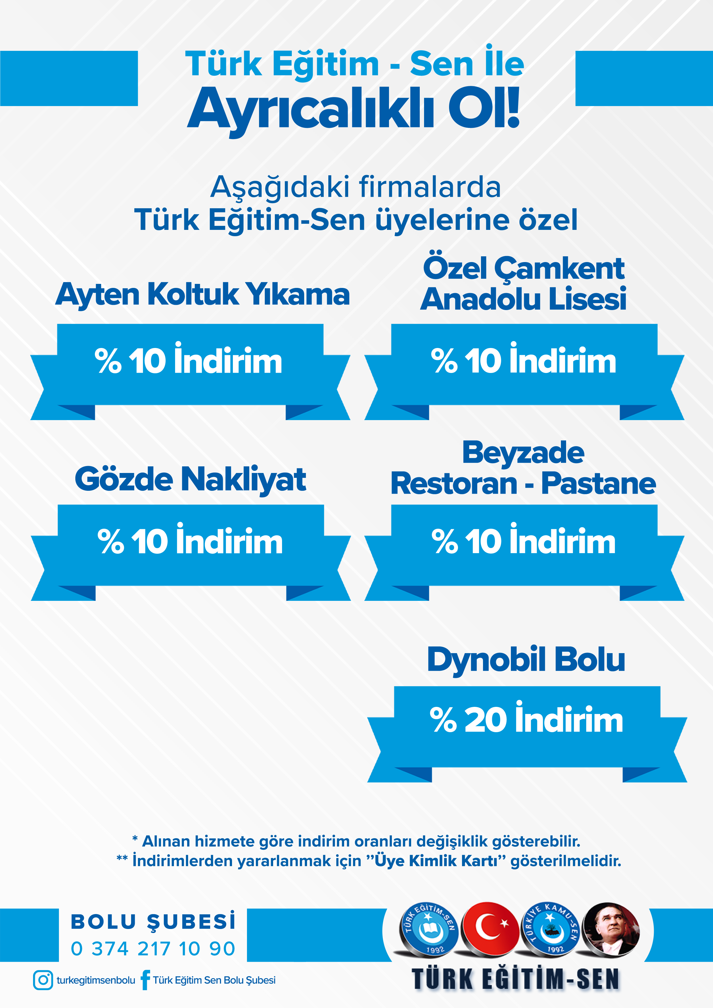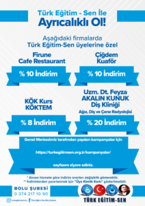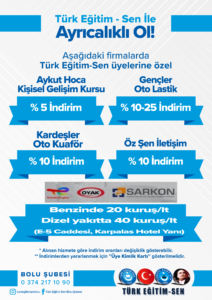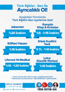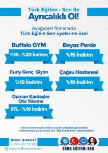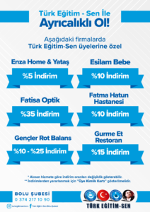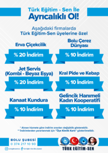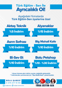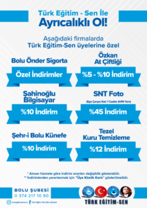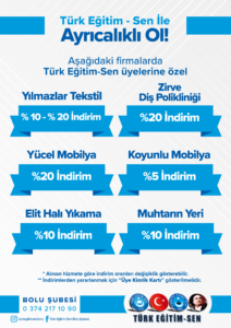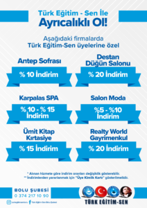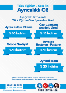 Türk Eğitim Sen Bolu şubesi olarak, üyelerimizin yararlanabileceği indirimlere ilişkin bilgilendirmeler bu sayfada sunulmuştur. İndirimlerden yararlanmak isteyen üyelerimizin, üye kimlik kartlarını firmalarca talep edilmesi durumunda ibraz etmeleri gerekmektedir. Yeni yapılan indirim anlaşmalarına ilişkin bilgiler bu sayfaya eklenecektir.