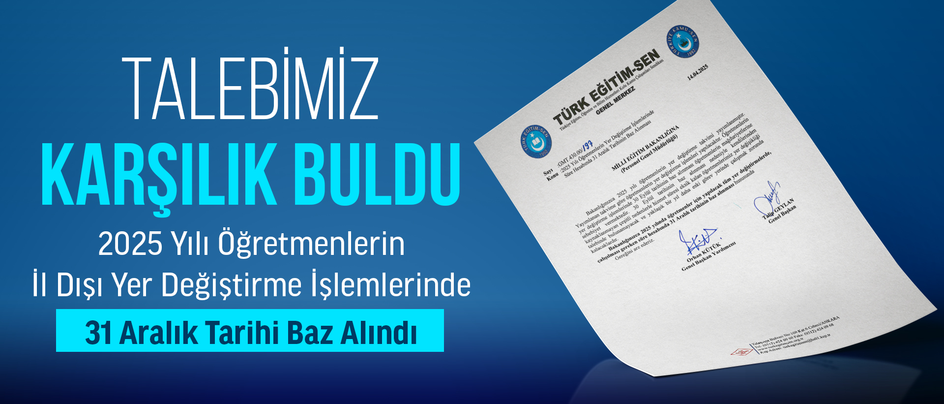 TALEBİMİZ KARŞILIK BULDU! 2025 YILI ÖĞRETMENLERİN İL DIŞI YER DEĞİŞTİRME İŞLEMLERİNDE 31 ARALIK TARİHİ BAZ ALINDI