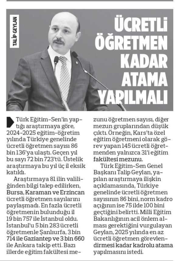 Ücretli Öğretmen Kadar Atama Yapılmalı – Türkgün